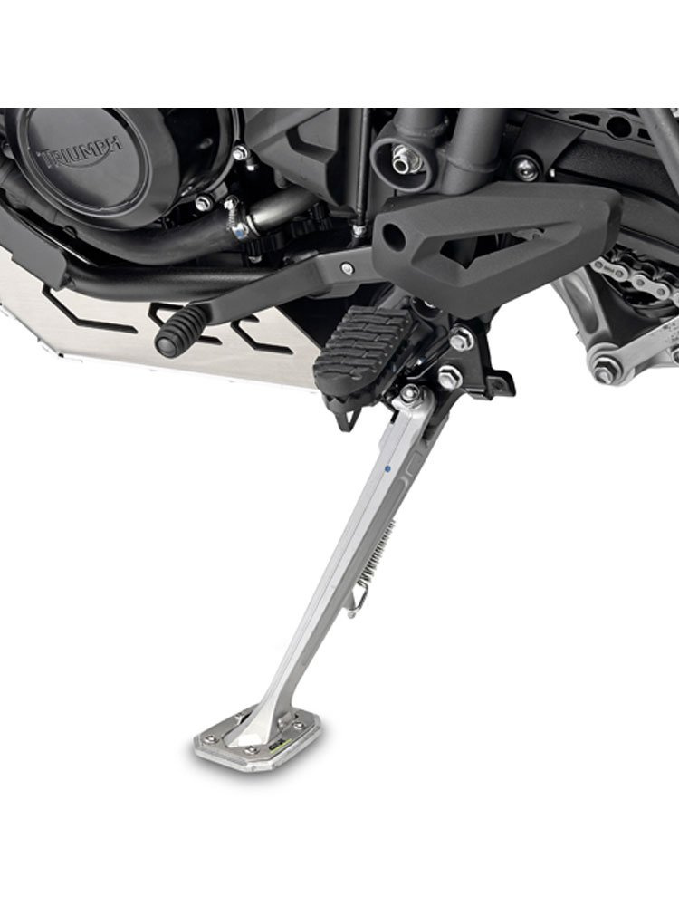 - specific support in aluminium and stainless steel to widen the surface support area of the original side stand,